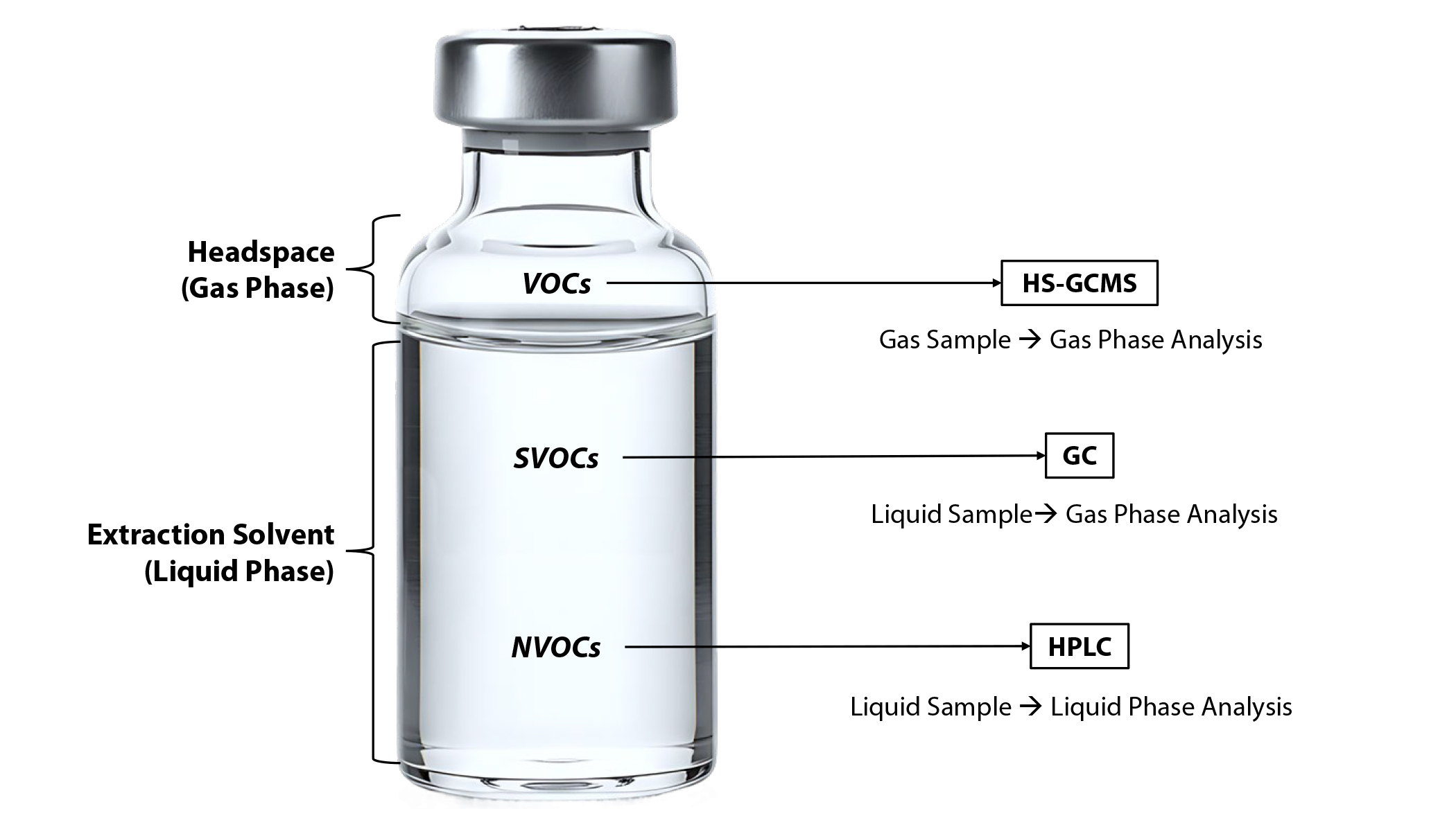 In an extract container, there are separate liquid and gas phases (see Figure). Once generated, VOCs are expected to have a greater affinity for existing in the gas phase above the extract. Therefore, headspace-gas chromatography mass spectrometry (HS-GCMS) has the greatest potential for producing the most accurate quantitation value for VOCs because this method samples directly from the headspace above the extract. Further, gas chromatography (GC) is an alternative option for measuring VOCs; however, since measurements taken using this method are representative of the liquid phase, concentrations of highly volatile compounds could be underestimated. At the same time, GC presents a credible alternative for measuring peripheral VOCs that are on the cusp of being classified as SVOCs.