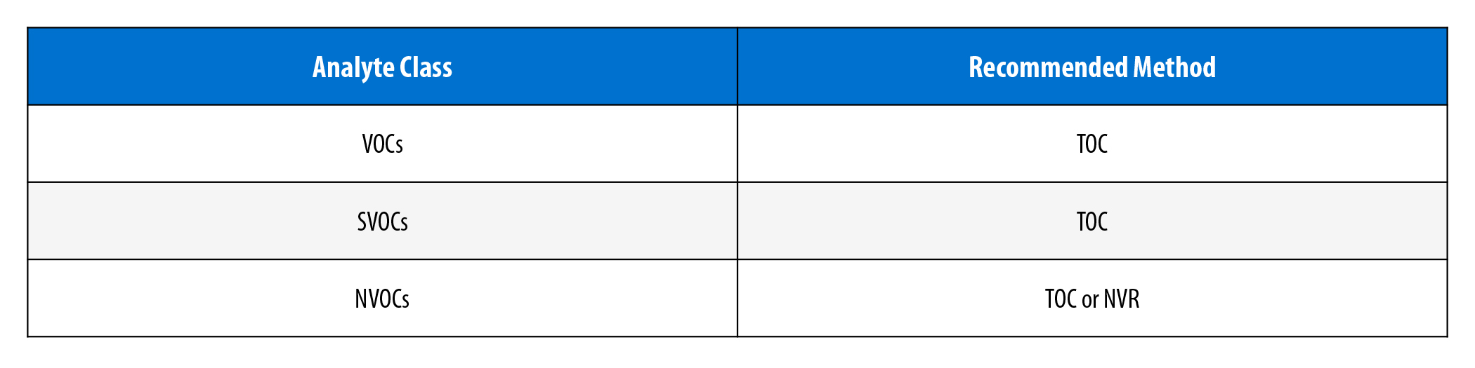 For carbon-containing VOCs, SVOCs, and NVOCs present in aqueous extracts, total organic carbon (TOC) analysis is an appropriate method for determining the amount of organic carbon contained in the residue. Additionally, NVOCs are compatible with non-volatile residue (NVR) determination, an alternative technique that uses gravimetric analysis. The process of gravimetric analysis involves evaporating the solvent from an extract and measuring the mass of the NVR that remains. As previously mentioned, NVOCs are not expected to readily volatilize. Therefore, unlike VOCs and SVOCs, NVR is a credible technique for assessing NVOCs, as this method of residue determination is compatible with organic and aqueous solvents.